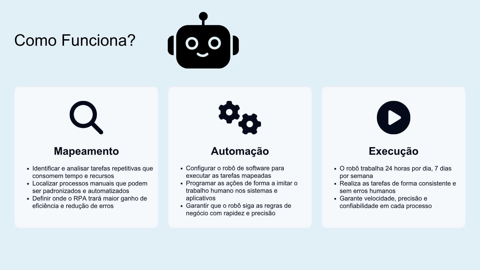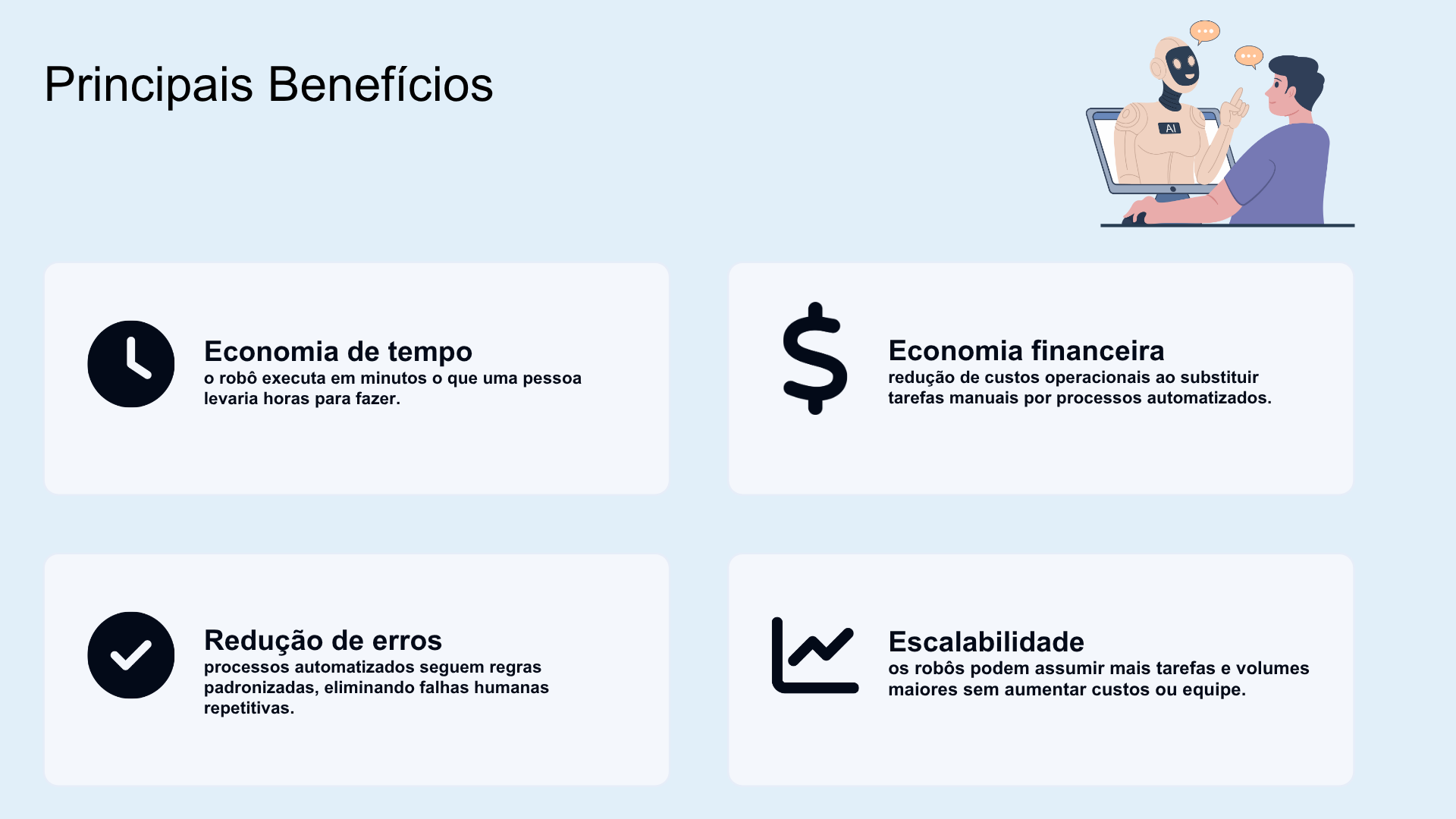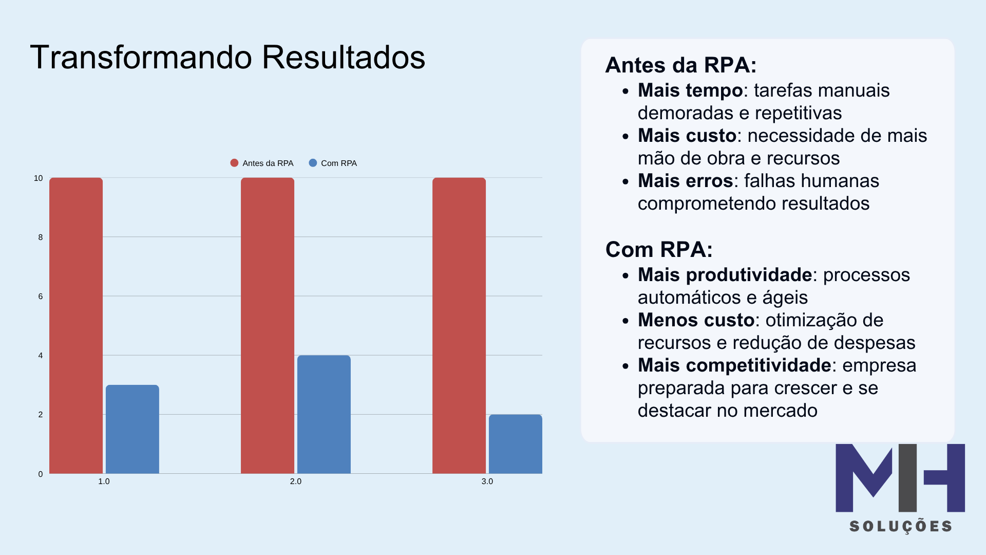 A tecnologia está transformando a maneira como as empresas operam. Com RPA e Inteligência Artificial, você pode eliminar tarefas repetitivas, reduzir erros e otimizar processos, permitindo que sua equipe foque no que realmente importa: a inovação e o crescimento do seu negócio.