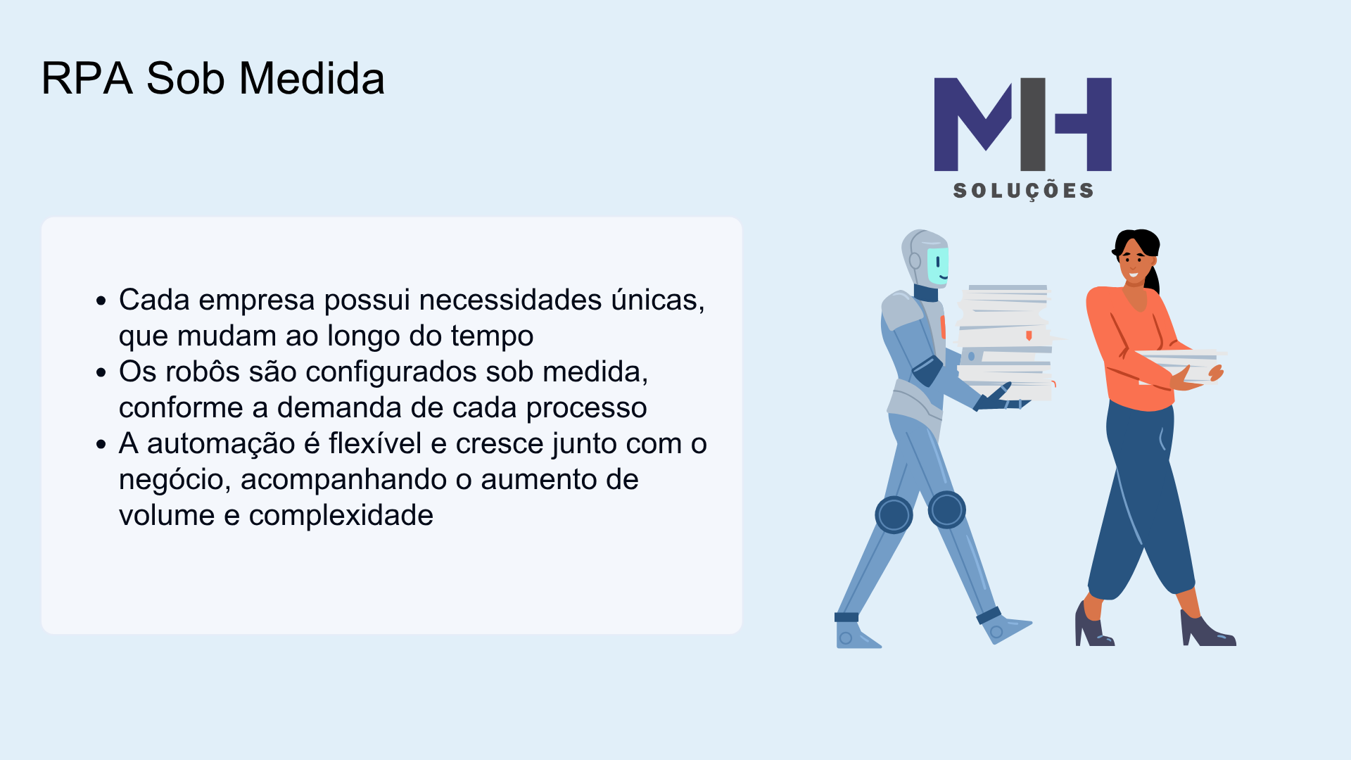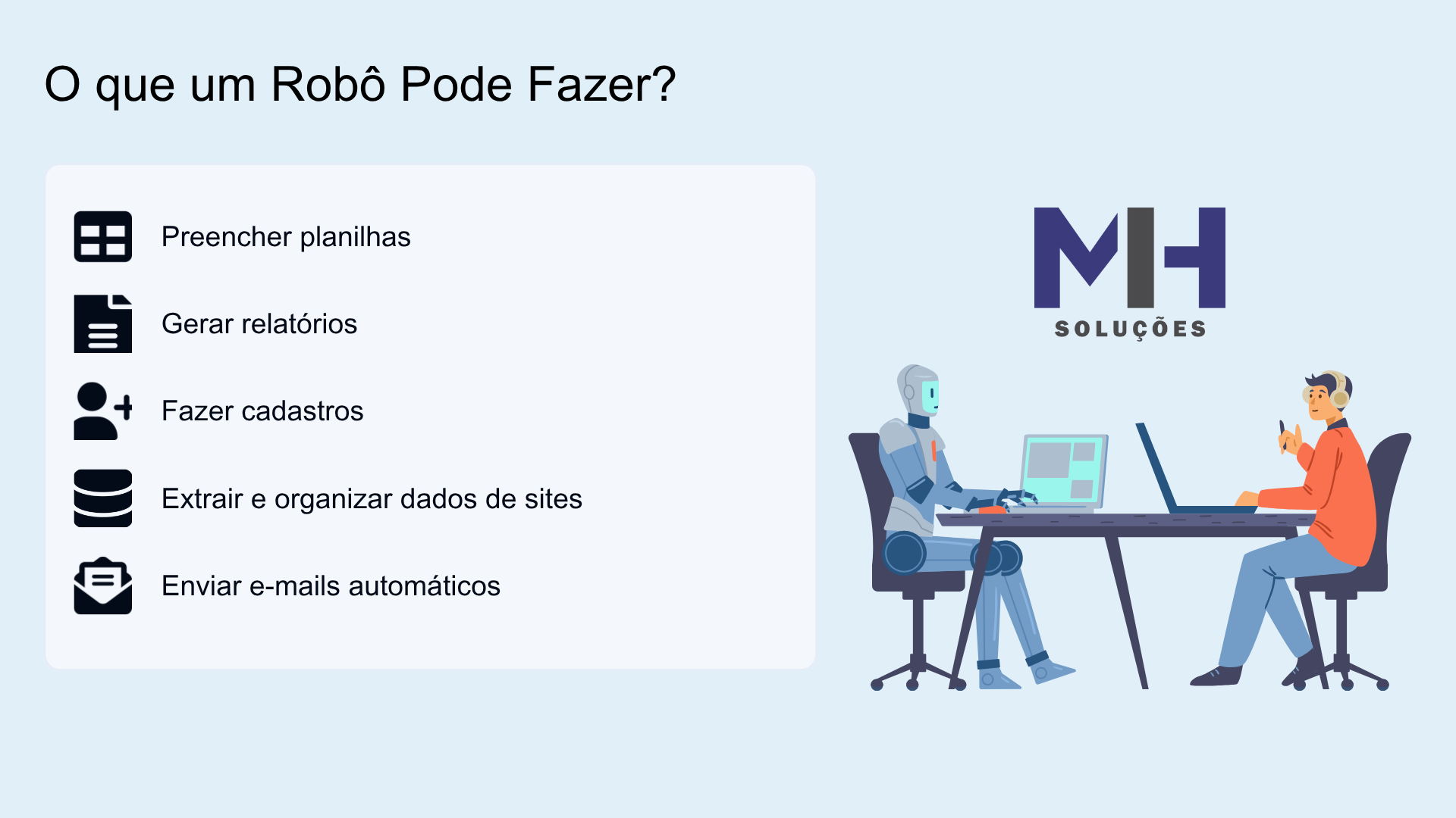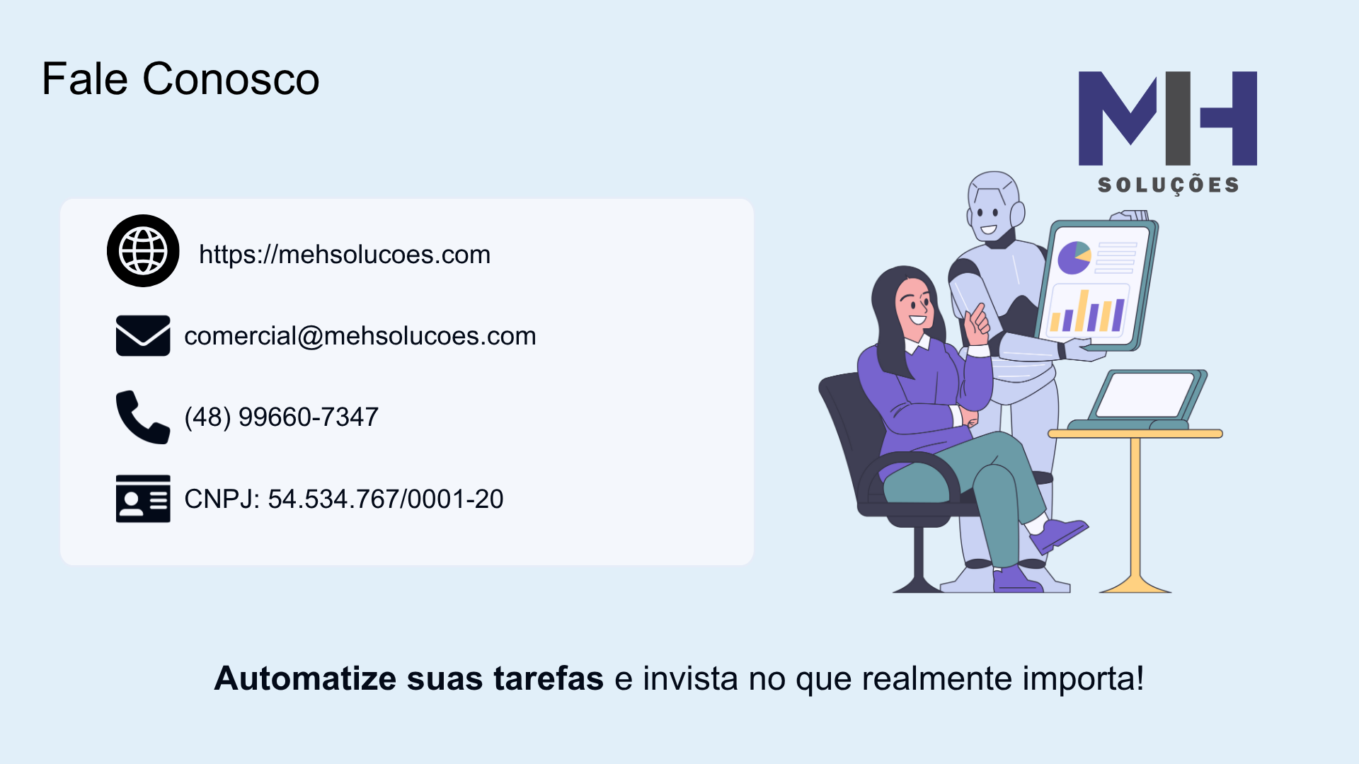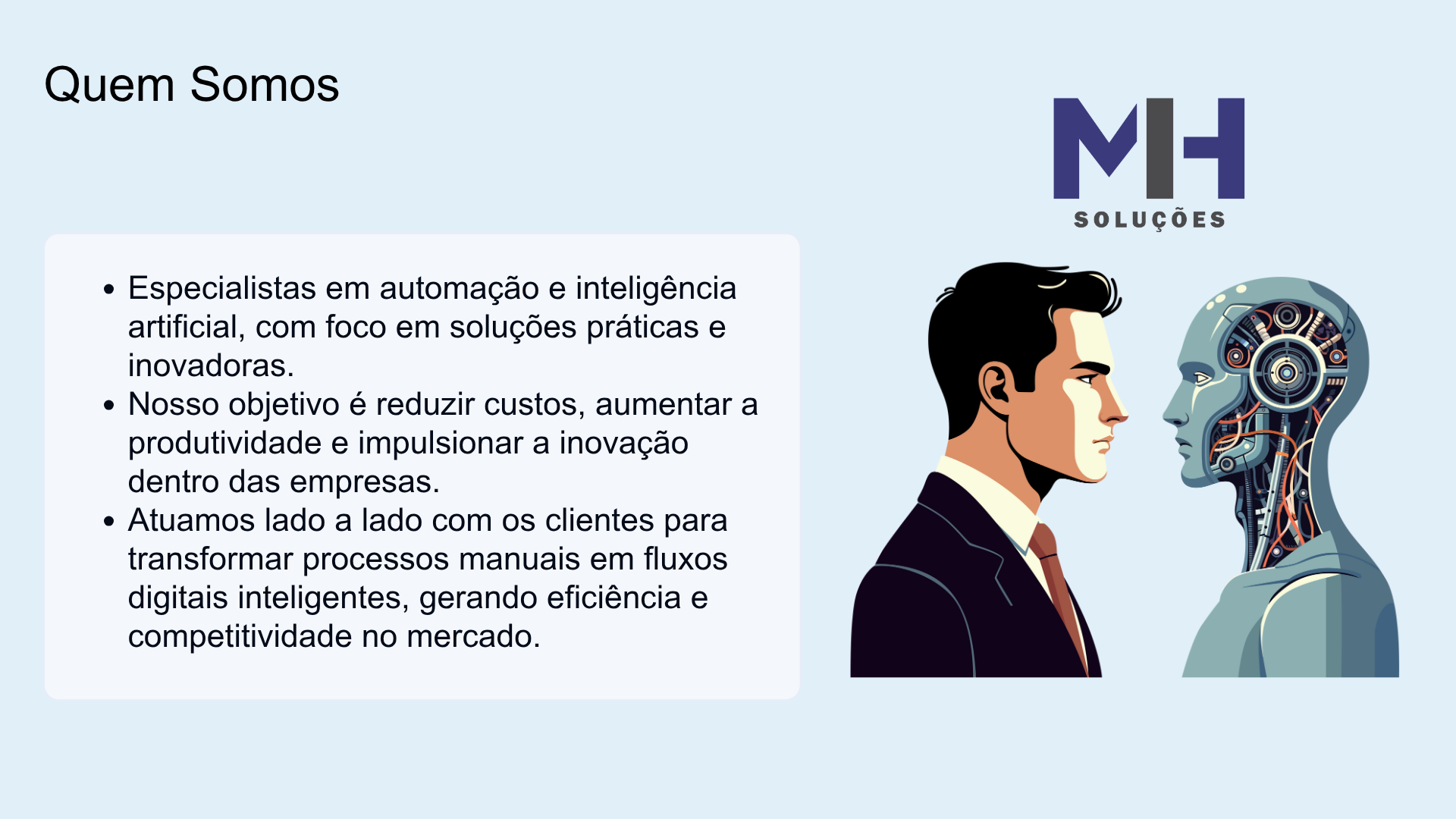 Na M&H Soluções, acreditamos que a tecnologia deve ser uma aliada para facilitar o dia a dia das empresas, eliminando processos manuais demorados e abrindo caminho para a inovação. Nossa missão é automatizar operações com eficiência e inteligência, garantindo que cada negócio possa crescer de forma escalável e sustentável.